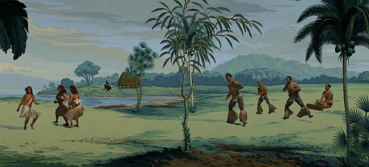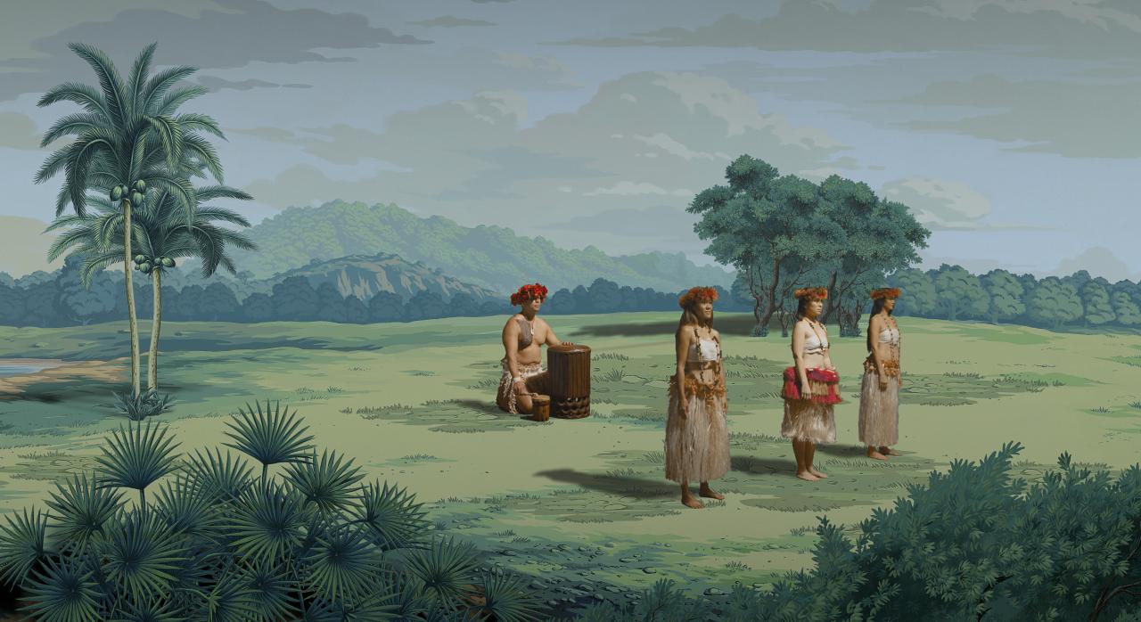 The video is enlivened with the sights and sounds of ritual songs and dances performed by graduates from Pacific Islander Performing Arts, Auckland, and other Pacific communities. Through extensive collaboration with Māori and other First Peoples she devised clothing, tattoos, choreography of song and dance, and scripting that gives each performer in her mise en scène an undeniable vitality and authenticity. These actors on Reihana’s vast panoramic field give voice, dance movement and substantial bodily presence to the artist’s cinematic wallpaper, parodying the frozen Grecian figures in the French Neoclassical original that it answers. Furthermore, Reihana sets the action against a carefully researched historical Tahitian landscape, encompassing customary architecture and sculpture that is punctuated by inaccurate drawings of Pacific flora, so that ‘in Pursuit of Venus [becomes] a palimpsest providing sidelong glances and investigating truths absent from the original work’.4