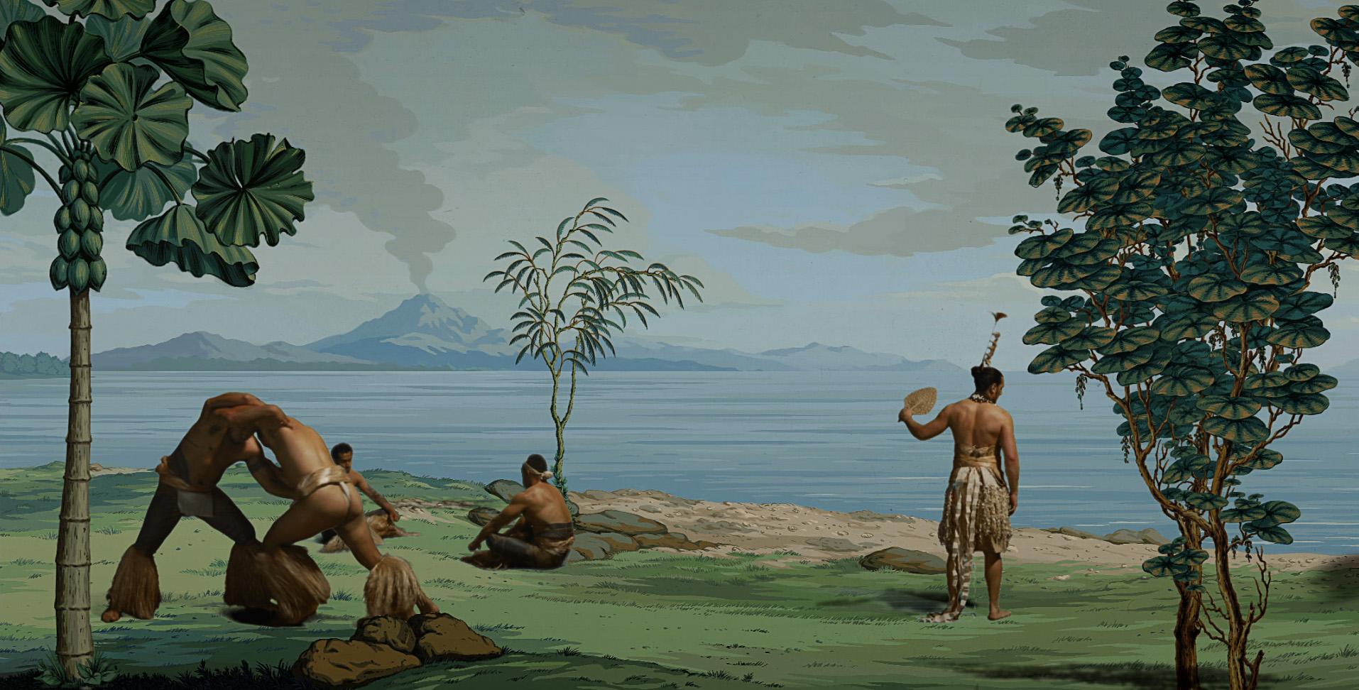 The two-channel video in Pursuit of Venus re-stages the celebrated early nineteenth-century Enlightenment wallpaper Les Sauvages de la Mer Pacifique, 1804‒05. This large hand-blocked, scenic wallpaper illustrated by Jean-Gabriel Charvet for French entrepreneur Joseph Dufour measures ten metres long by more than two metres high and comprises twenty separate panels. It was designed as a delectable ‘entertainment’ to embellish the interior of a wealthy European or American stately home, transforming it into a lush Tahitian paradise. Charvet sourced his illustrations from scenes of indigenous life and stories of encounter detailed in the records and journals of the Pacific voyages of exploration undertaken by Captain Cook, Louis de Bougainville and Jean-François de Galaup La Pérouse. Les Sauvages claims to be historical but the Māori, Pacific and First Nations peoples featured in the wallpaper are cast in Hellenic poses, outfitted in Grecian drapery and disconnected from their cultural, political and historical reality. In locating the indigenous communities within a fictional utopia, Les Sauvages reflected Enlightenment humanist values of the noble savage, espoused by Jean-Jacques Rousseau, and mirrored widespread European fascination for Pacific voyages, ‘exotic’ themes and ritual practices and Pacific Islander people.